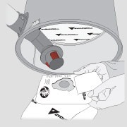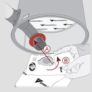 Assurez l'étanchéité en insérant le sac jusqu'à la bague de rétention (A). Effectuez une rotation du sac d'environ 20º ( B), vous assurant que les encoches du sac ne sont plus alignées avec les pointes de l'adaptateur. Replacez la cuve et fermez hermétiquement à l'aide des deux attaches.